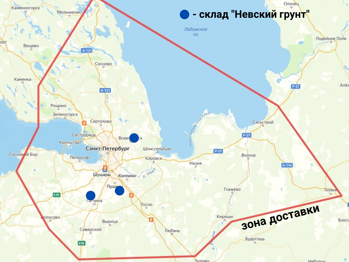Компания "Невский грунт" доставляет свою продукцию по всей территории Ленинградской области и Санкт-Петербурга.